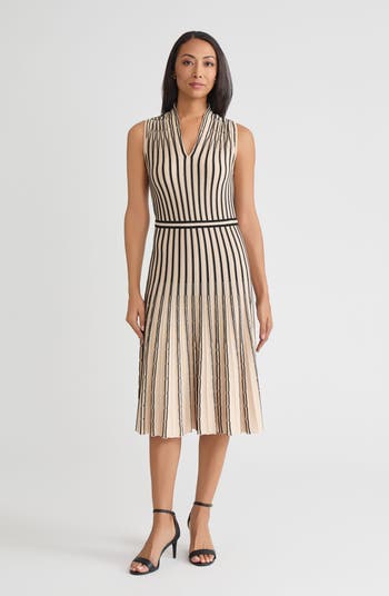 The Fit & Flare Sleeveless Striped Soft Ribbed Knit Dress blends modern sophistication with effortless comfort. Crafted from a smooth, softly ribbed knit, it features a striking vertical stripe pattern designed to elongate the silhouette. The refined V-neckline and fitted bodice transition beautifully into a gently flared, mid-length skirt that moves with ease. Finished with a subtle waistband for added definition, this dress offers a polished, feminine look perfect for daytime elegance or elevated evenings out.