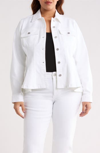A fit-and-flare silhouette brings a dose of sweetness to a classic trucker jacket made from cotton-blend denim with a touch of stretch for all-day comfort.