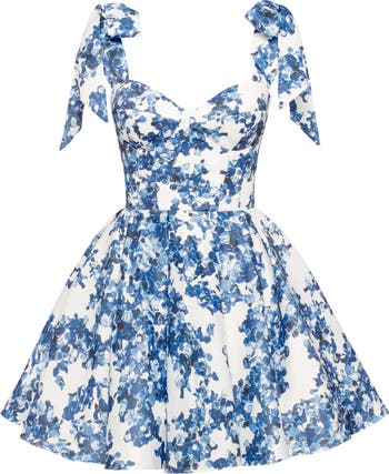 This floral satin mini dress features a fitted heart-shaped corset bodice and an A-line mini skirt. Designed with wide bow straps that can be tied for an adjustable fit, the dress offers both support and styling versatility. The lace-up back closure provides a customizable fit, while a cinched waist is defined with a signature silver belt detail. Available in blue hydrangea and pink peony floral prints. Designed for cocktail parties, garden parties, wedding guest outfits, summer events, and special occasions.