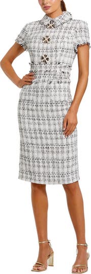 Classic meets modern in this fitted bouclé midi dress, designed with short sleeves, a button-up front, and refined feminine structure.