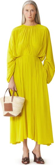 The Charmeuse fabric of this dress is distinguished by its finesse, fluidity and satin-like finish. These characteristics are achieved thanks to an ancient Japanese technique and the use of pure water during the manufacturing process. The gathers and high collar elegantly structure the silhouette for a sophisticated look that is suitable for both day and evening wear.
