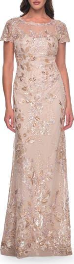 Long evening dress with beautiful lace, beading, and sequin design. Illusion high neckline and short sleeves. Back zipper closure.