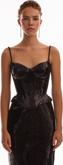 - Detail: Fully sequined construction with structured corset bodice for a glamorous, statement finish