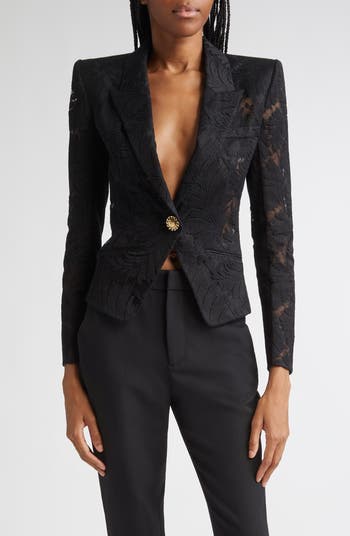 A featured piece in Balmain's pre-fall '25 lookbook, this fitted lace blazer is a simply done yet stunning example of Olivier Rousteing's infusing of this year's Met Gala's Black Dandyism theme into his women's styles.