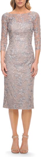 Fitted lace below-the-knee dress with illusion top. Three-quarter sheer lace sleeves and slight V back. Back zipper closure.
