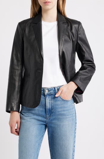 A buttery take on the classic blazer is offered in luxe lambskin and lined in pretty pink satin.