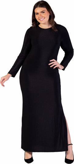 Fitted Long Sleeve Shimmery Fabric Side Slit Maxi Dress