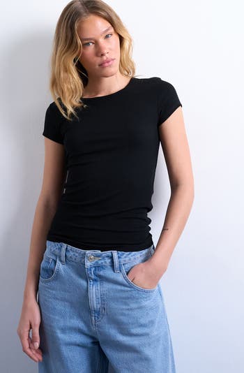 Mini ribs hug your shape in this short-sleeve T-shirt made from a stretch-enhanced rib knit.