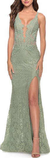 Long lace gown with deep plunging neckline and leg slit. Sheer bodice and V back with keyhole. Back zipper closure.