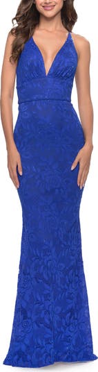 Stretch lace fitted prom dress with banded waist and deep V neckline. Open lace up back. Back zipper closure.