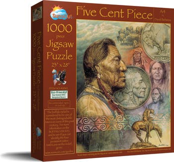 Discover the enchanting realm of the Five Cent Piece 1000 piece jigsaw puzzle by SunsOut, a splendid masterpiece showcasing the intricate artwork of renowned artist David Behrens. Gain insight into the rich tapestry of Western Americana as each piece uncovers historical narratives of the celebrated five-cent coin and the diverse cultures it signifies. Backed by SunsOut’s hallmark of excellence, this 23" x 28" puzzle features interlocking pieces for smooth assembly, and utilizes top-grade recycled cardboard for durability, promising hours of worry-free enjoyment. With a steadfast commitment to quality and customer service, SunsOut, a proudly woman-owned small business, ensures swift resolution of any missing or damaged pieces. Echoing an eco-conscious ethos, SunsOut embraces sustainable practices using prime recycled materials and eco-friendly soy-based inks in their puzzles, marrying art and sustainability. Further, the licensed artwork guarantees authenticity and celebrates the spirit of artistic collaborations. Perfect for both avid and novice puzzle enthusiasts, this 1000 piece marvel merges history, art, and entertainment, emerging as a thoughtful gift and a cherished addition to any collection—truly the embodiment of Western Americana Collage. Embark on a timeless journey of creation and artistry with the Five Cent Piece puzzle by SunsOut.