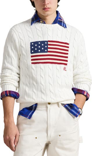 The brand's Team USA collection plays to win in an all-cotton sweater knit with traditional cabling and the Stars & Stripes waving brightly across the chest. Comfortable enough to wear on its own, it layers easily when the temperatures cool and the patriotism heats up.