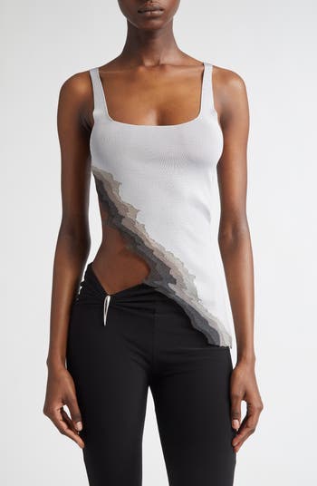 From Grace Ling's 'Neanderthal' collection comes this finely ribbed tank traced with sheer, colorblocked panels along the dramatic asymmetric hem, as if a flame is burning the fabric away. Ling's spring '25 outing is a sensual spin on primitive forms reimagined through her futuristic lens.