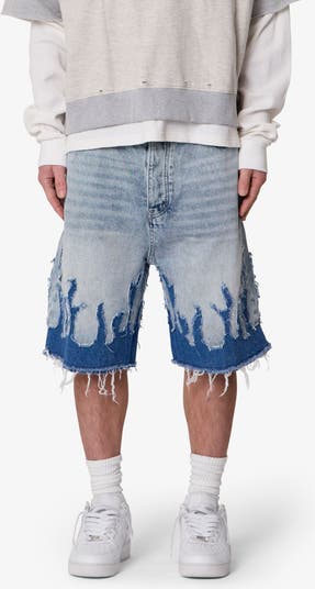 Well-faded cotton denim layered under dark, threadbare flames brings bold energy to shorts that are chopped at the knees and styled to heat up any casual look.