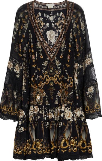 A limited-edition print—an ode to the ornate baroque scrollwork of Spanish palaces—displays a garden's worth of blooms on this tiered silk minidress, where panels of sheer floral lace reveal peekaboo glimpses of skin. Camilla's hand-set diamanté sparkles offer a final flourish of grandeur and glamour.