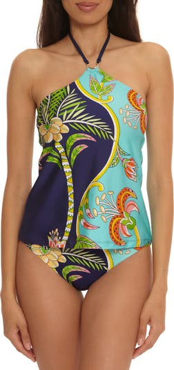 A bold tropical print enhances the vacation vibes of this tankini meant to highlight your shoulders and back.
