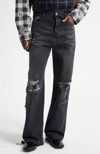 Monogram embroidery delicately details the plaid flannel patches on a pair of tattered jeans cut from Italian cotton and finished with fraying hems.