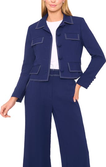 Pronounced topstitching outlines this tailored cropped jacket accented with pocket flaps.