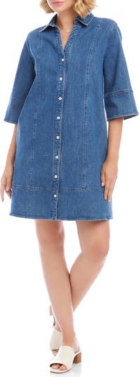 Vertical seams streamline the silhouette of this casual and chic stretch-denim shirtdress framed by flared three-quarter sleeves and popped with handy pockets.