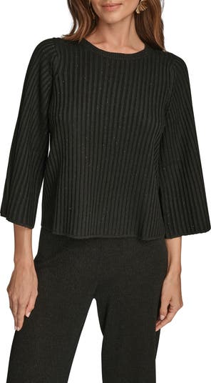 A smattering of minuscule sequins catches the light on a rib-knit top framed by flared three-quarter sleeves.