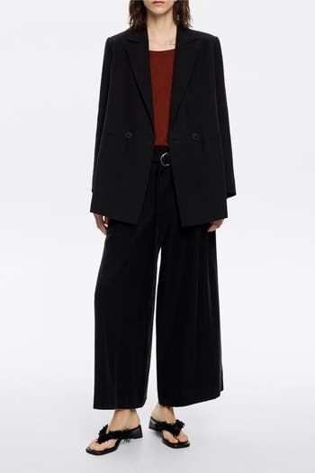Viscose trousers with flared cut, ankle length, and adjustable waistband.