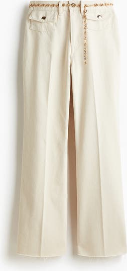 Jeans in rigid cotton denim that feels firm at first but then softens and loosens with wear. Flared leg with a slim fit from the waist to the thigh and a flared cut from the knee to the hem. High waist with a zip fly and button. Metal chain belt, flap front pockets with a button and open back pockets. Creases down the front and back, and raw-edge hems. Regular length, designed to hit the top of the foot with little or no stacking. A defining shape from season to season.