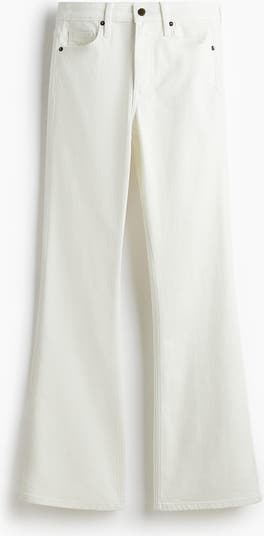 5-pocket jeans in denim with a slight stretch for good comfort. Flared leg with a slim fit from the waist to the thigh and a flared cut from the knee to the hem. High waist with a zip fly and button. Longer length, designed to fall over the foot with a stacking effect. Style with everything from cropped tops to chunky knitwear.