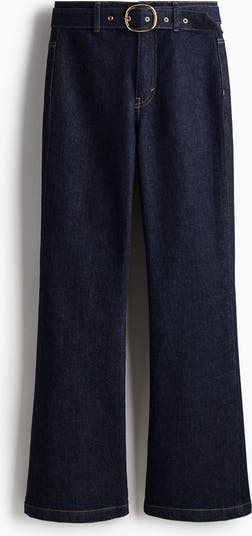Jeans in cotton denim with a slight stretch for good comfort. Flared leg with a slim fit from the waist to the thigh and a flared cut from the knee to the hem. High waist with a belt, zip fly and a hook-and-eye fastener. Regular length, designed to hit the top of the foot with little or no stacking. Style yours with everything from trainers to ankle boots.