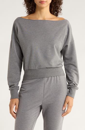 A raw-edge boat neck gives casual flair to this dance-inspired sweatshirt.