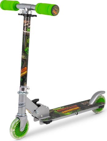 FLASHING SCOOTER: DINOSAUR - Let your child ride in style with the vibrant and eye-catching scooter, complete with light-up wheels and a flashing deck that illuminates as they scoot. Designed for kids ages 5 and up, this scooter features an adjustable T-bar handlebar with a height range of 28.5" to 32.5", allowing it to grow with your child. The light-up PVC wheels activate automatically when the scooter is in motion, creating a fun and colorful ride that stops flashing when the scooter is stationary. Crafted from durable materials, including PVC wheels, PU foam handles, and a sturdy steel frame, this scooter supports up to 100 pounds, making it a reliable choice for young riders. For convenience, it includes an easy fold-and-lock mechanism, making it simple to fold down and carry. With smooth-ride bearings and a rear foot brake for safe stopping, the scooter provides a stable and smooth riding experience. The Flashing Scooter is equipped with comfortable foam grip handles for added control and comfort during long rides. It’s the perfect choice for outdoor recreational fun, whether cruising around the neighborhood or riding with friends. Please note that it requires 3 AA batteries (not included) for the lights. Dimensions: 12.99"L x 26.38"W x 29.53"H. Remember to wear safety gear, including a helmet, elbow, and knee pads, for added protection. With its unique dino design and flashing features, this scooter will make your child the envy of the neighborhood!