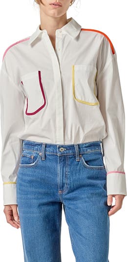 Rainbow trim lends playful character to a crisp button-up shirt completed by a stylish curved hem.