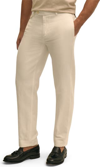 A linen-and-cotton blend brings lived-in looks and everyday comfort to chinos that sit just above the hips and stay slim down to the hems. Tailored with traditional flat-front construction, they make a versatile addition to your casual and elevated-casual wardrobes.