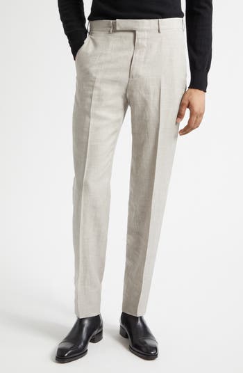 Crisp creases and a flat front lend a refined look to beige trousers tailored from a lightweight blend of Italian wool, linen and silk that makes them perfect for warm-weather semiformal occasions.
