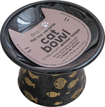 DEXYPAWS: FLAT TOP CERAMIC BOWL FOR CATS - BLACK FISH PRINT - Say goodbye to whisker stress and hello to happy, comfortable mealtimes with our Whisker Fatigue Cat Bowls! These thoughtfully designed bowls feature a flat top surface that allows your cat's whiskers to remain unobstructed while they eat or drink. With our bowls, your cat can enjoy their meals without the discomfort of their whiskers rubbing against the sides of deep bowls, making them the perfect solution for cats prone to whisker fatigue or sensitivity. Crafted from QUALITY materials, our bowls are not only durable and scratch-resistant but also built to withstand the rigors of everyday use. Each bowl is designed with your cat's comfort in mind, ensuring a pleasant dining experience every time. Plus, they’re easy to clean, making mealtime prep and cleanup a breeze for you. Lightweight yet sturdy, it's ideal for both kittens and adult cats alike. Elevate your cat's dining experience and promote their well-being with our Whisker Fatigue Cat Bowls—the ultimate choice for discerning feline friends!