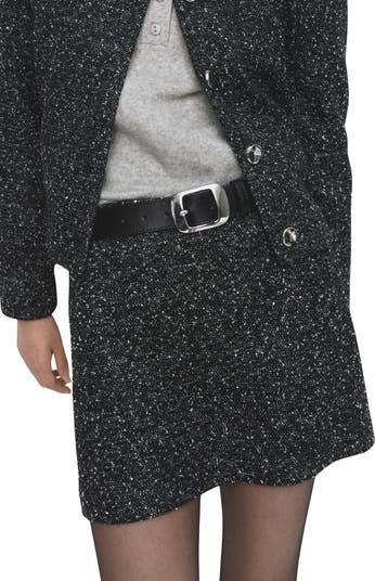 This black-and-white knit skirt makes texture the point, with a speckled weave that reads rich and dimensional up close. The straight, stem-baring silhouette stays clean and minimal so the fabric can lead.