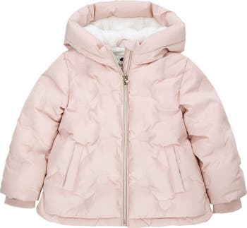 Heart-patterned water resistant shell with a warm fleece lining, rib cuffs, and side slits. This adorable and practical coat keeps your little one cozy and stylish for any adventure.