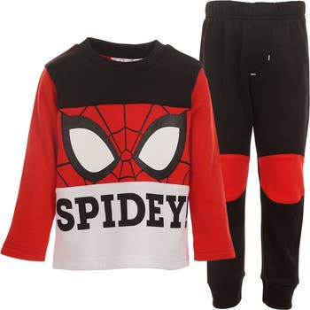 Your little hero will be ready for chilly day adventures in this Spider-Man fleece outfit set! Featuring a bold graphic sweatshirt and matching jogger pants with cool knee patches, this officially licensed look is full of web-slinging style. Made from soft fleece with ribbed cuffs and an adjustable drawstring waist, it's perfect for everyday comfort, outdoor play, and cozy winter wear. Spidey fans will love suiting up in this action-ready favorite!