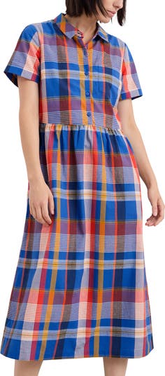 The prairie-picnic vibes are strong in this colorful check shirtdress cut from organic cotton to a classic midi silhouette that's fitted at the bodice then falls to a full skirt.