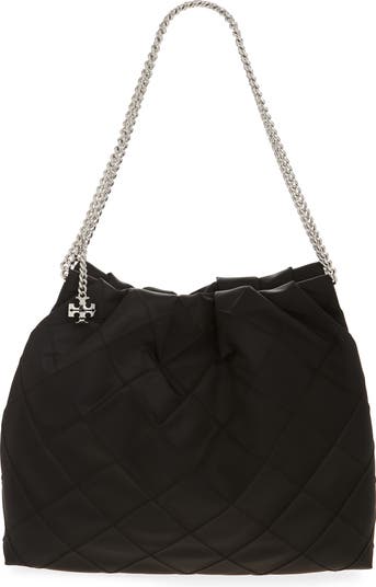 A textured diamond pattern and iconic logo charm style a spacious nylon hobo bag perfect for storing your daily essentials while on the go.