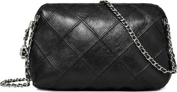 A textured diamond pattern highlights the distressed leather exterior of a voluminous bag suspended from a pull-through chain strap that easily converts for shoulder or crossbody wear.