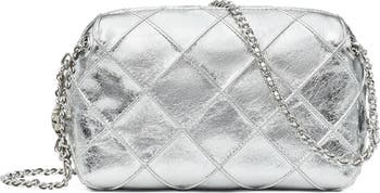 A textured diamond pattern highlights the metallic leather exterior of a spacious bag suspended from a pull-through chain strap that easily converts for shoulder or crossbody wear.