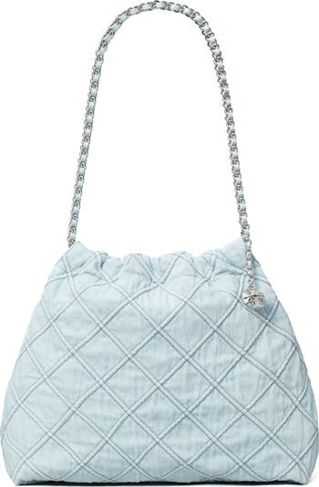 A textured diamond pattern and iconic logo charm style a spacious denim hobo bag perfect for storing your daily essentials while on the go.