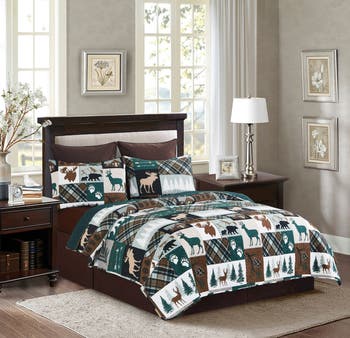 With a classic printed patchwork of wilderness motifs and coordinating plaid, the Fletcher Forest quilt set brings rustic lodge style to any bedroom. Use this luxury oversized and machine washable quilt in your holiday guest room or in the master suite of your mountain cabin.