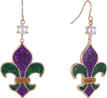 Step into celebration with these stunning Mardi Gras fleur-de-lis drop earrings, featuring bold purple, gold and green glitter enamel. A bold, sparkling accessory that brings the spirit of Carnival wherever you go. Designed to dazzle, these earrings bring the perfect amount of shine and movement—ideal for parade season, parties, or adding festive flair to any outfit.