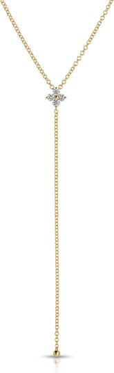 Twinkling round diamonds in a floral formation at the heart of this delicate Y-necklace cast in 14-karat gold.