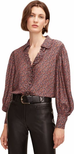• Anintricate fleur motif is complemented by delicate ruffled trim and voluminous sleeves on this silk blouse. Model is 5'10" and wearing a size 2/small 100% silk Dry clean only