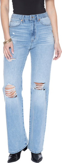 Elevate your denim game with the Flex Back Skyscraper jeans, featuring a high-waisted design and a light blue wash with distressed details for a trendy look.