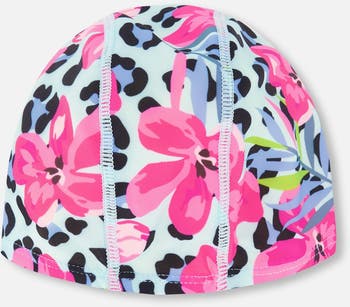 This swim cap with flower and leopard print keeps little swimmers stylish and comfortable in the pool. This swimming accessory features a charming allover flower and leopard print on a soft stretch fabric which provides a snug fit that stays in place while they splash and play. Made with recycled polyester and elastane, it offers both eco-conscious design and lasting wear.