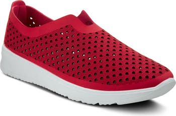 This flexible slip-on sneaker featuring diamond-shaped cutouts and an etched design is outfitted with a shock-absorbing, slip-resistant sole and cushioning.