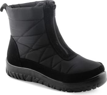 Take on the chilly weather in this hike-ready bootie with a zippered front, fold-out metal ice grip at the base of the heel and warm faux-fur lining.